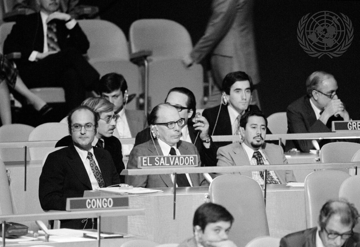 The delegation of El Salvador headed by Mauricio Alfredo Borgonovo Pohl (left), Minister for External Relations. Seated next to him is Reynaldo Galindo Pohl, Permanent Representative to the UN.