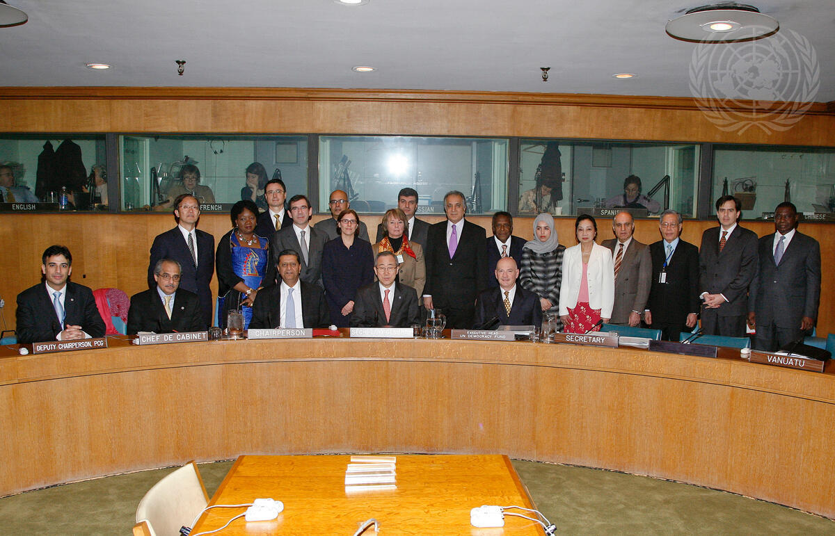 Secretary-General Ban Ki-moon (fourth from left, seated), Vijay Nambiar (second from left, seated), Chef de Cabinet; Amir A. Dossal, Executive Director of the United Nations Office for Partnerships (third from left, seated); and Roland Rich (right, seated), Executive Head of the United Nations Democracy Fund (UNDEF), in a group photo with the participants in the United Nations Democracy Fund Advisory Board meeting.
