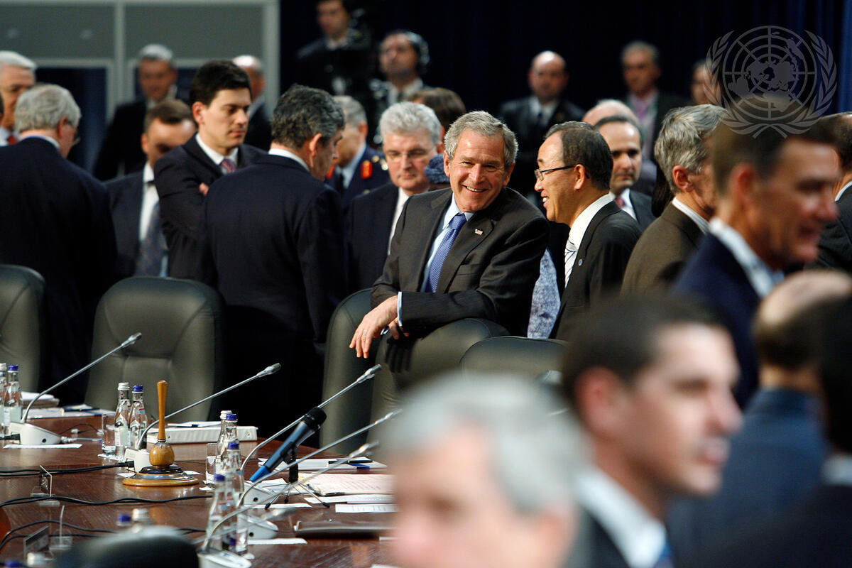 Secretary-General Ban Ki-moon speaking with George W. Bush, President of the United States of America, at a meeting of the Heads of State and Government of the 26-member North Atlantic Treaty Organization (NATO), on the situation in Afghanistan and Kosovo.