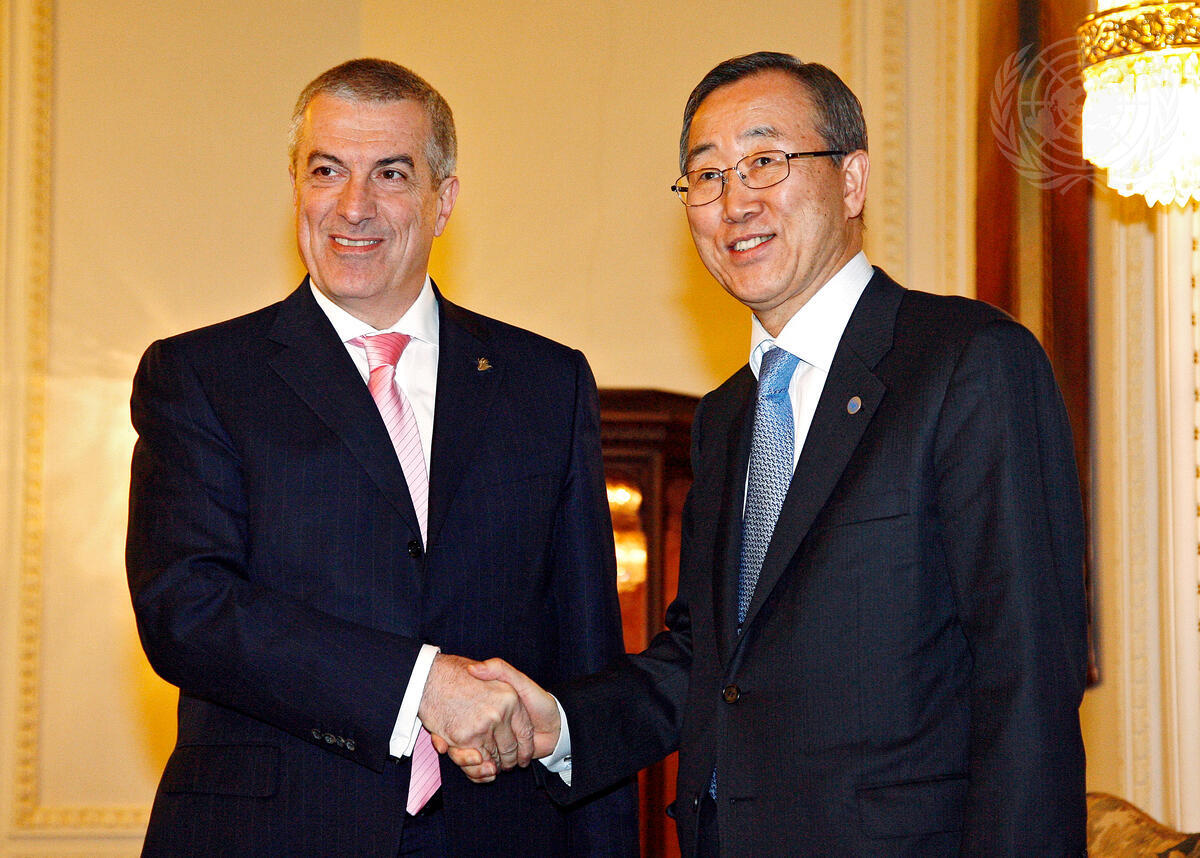 Secretary-General Ban Ki-moon (right) meets with Calin Popescu-Tariceanu, Prime Minister of Romania.