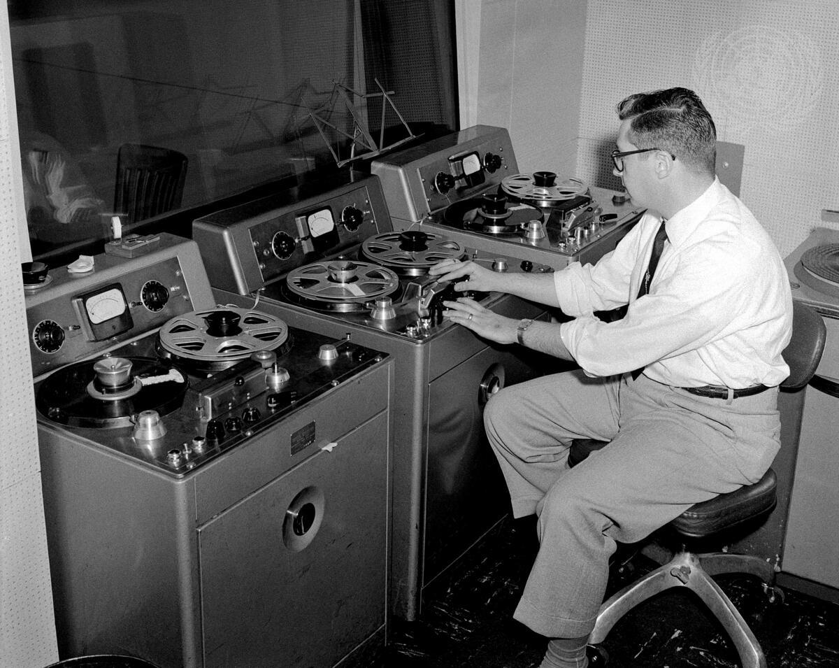 A partial view of the Studio Control Room of the United Nations Radio Division at U.N. Headquarters in New York, showing three ""Ampex"" tape recorders.