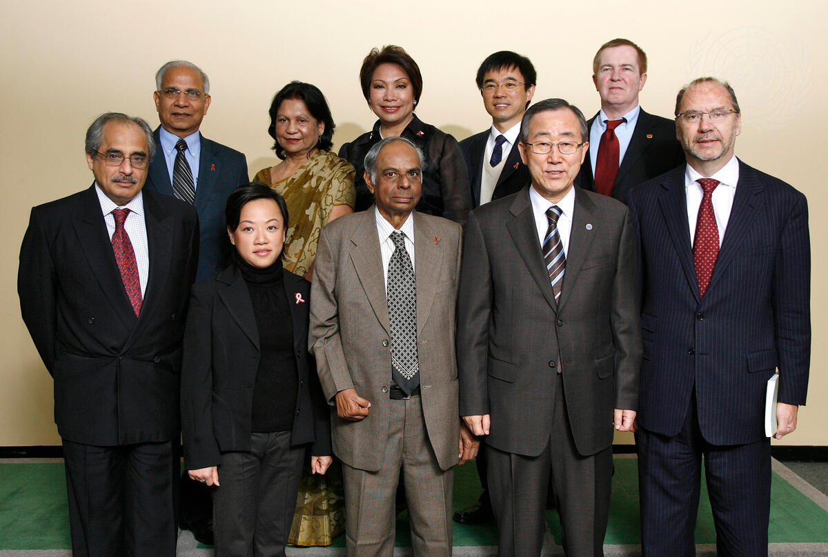 Secretary-General Ban Ki-moon (second from right, front row ), Vijay Nambiar (left, front row), Chef de Cabinet; and Peter Piot (left, front row), Executive Director of the Joint United Nations Programme on HIV/AIDS; in a group photo with Chakravarthi Rangarajan (centre, front row), Chair of the Independent Commission on AIDS in Asia; Frika Chia Iskandar (second from left, front row), Coordinator of the Asia Pacific Network of People Living with HIV and AIDS; and other members of the Independent Commission on AIDS in Asia.