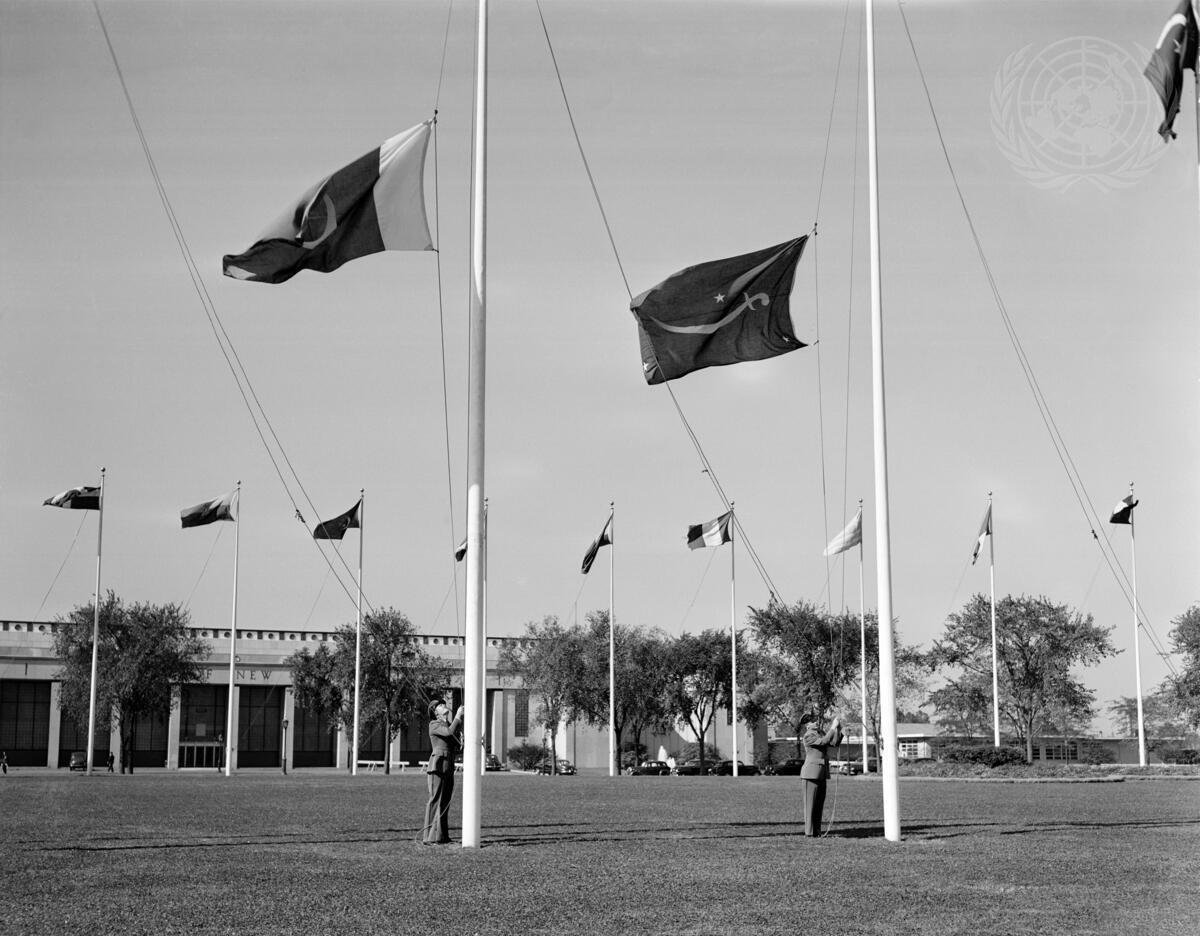 Flags of Yemen, right, and Pakistan are raised during ceremony of admittance of the two nations to the United Nations at the 90th plenary meeting of the second session of the General Assembly.