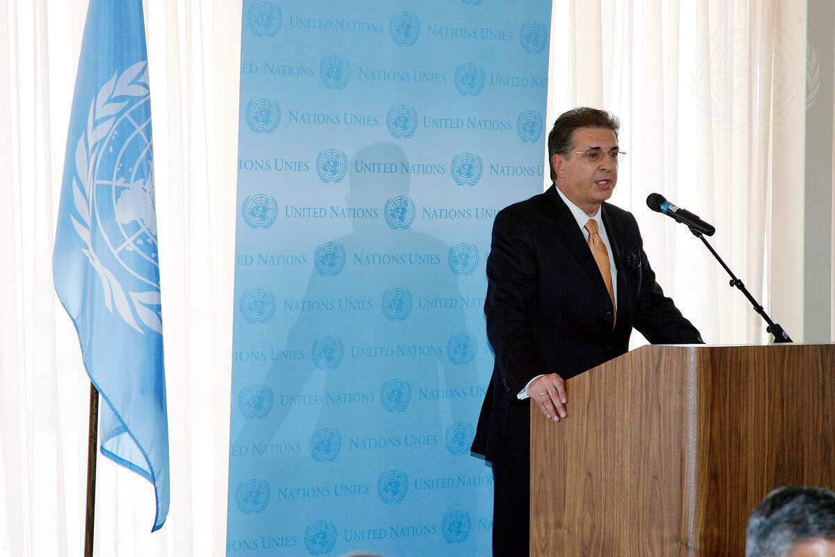 Srgjan Kerim, President of the sixty-second session of the General Assembly, addresses guests at a luncheon he hosted on the occasion of the General Assembly's two-day thematic debate entitled ""Addressing Climate Change: The United Nations and the World at Work"".