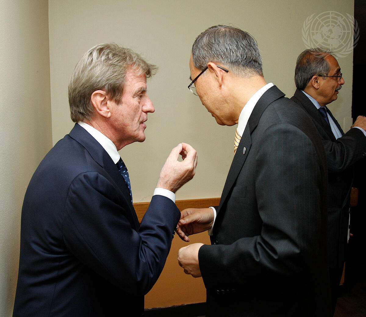 Secretary-General Ban Ki-moon (centre) confers with Bernard Kouchner, Minister for Foreign Affairs of France.