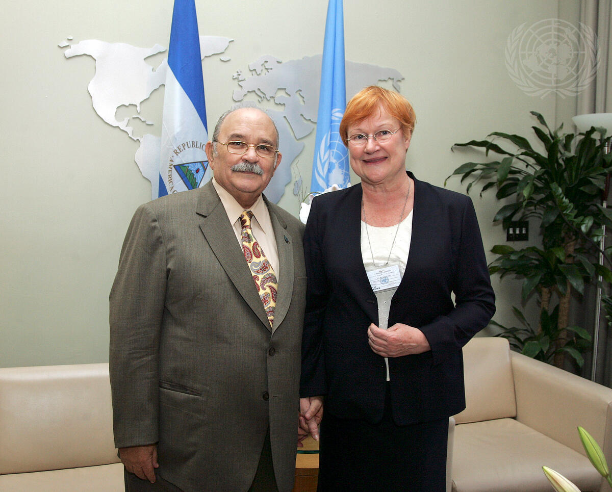 Miguel d'Escoto Brockmann (left), President of the sixty-third session of the General Assembly, meets with Tarja Halonen, President of Finland.