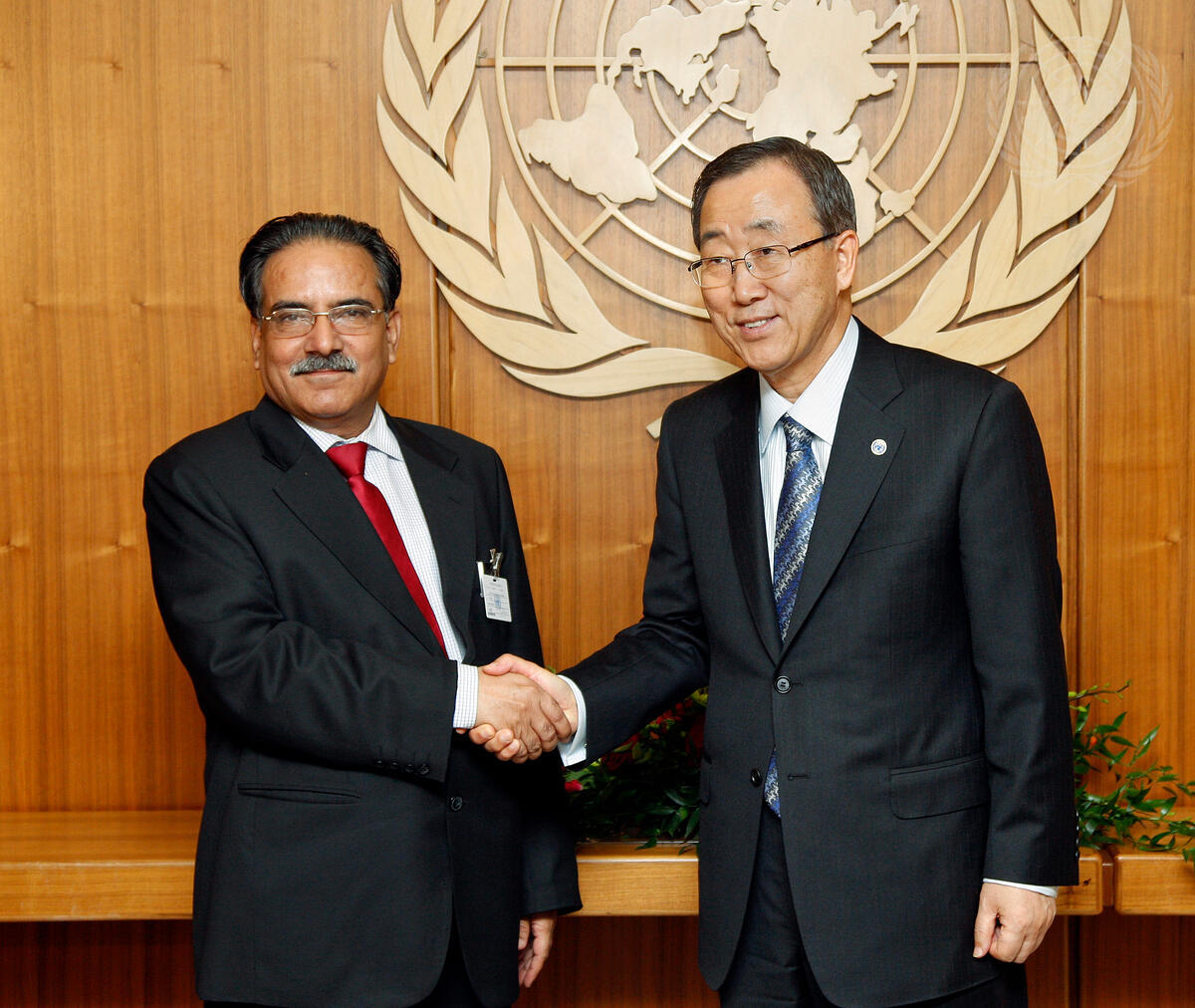 Secretary-General Ban Ki-moon (right) meets Pushpa Kamal Dahal, Prime Minister of Nepal.