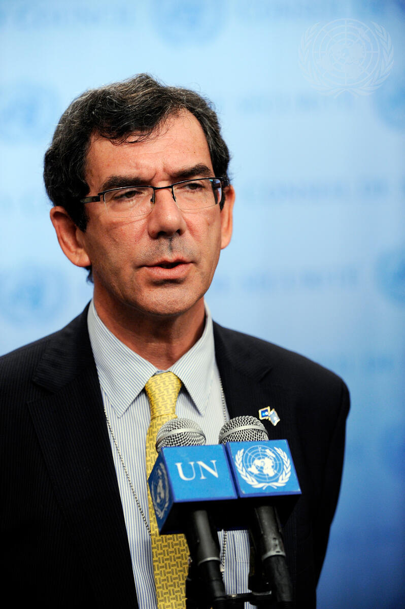 Jean-Maurice Ripert, Permanent Representative of France to the United Nations, briefs correspondents, following a Security Council meeting on non-proliferation.