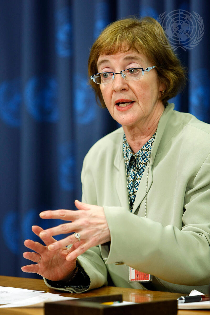 Maude Barlow, United Nations senior adviser on water issues, addresses a press conference on human rights and water.