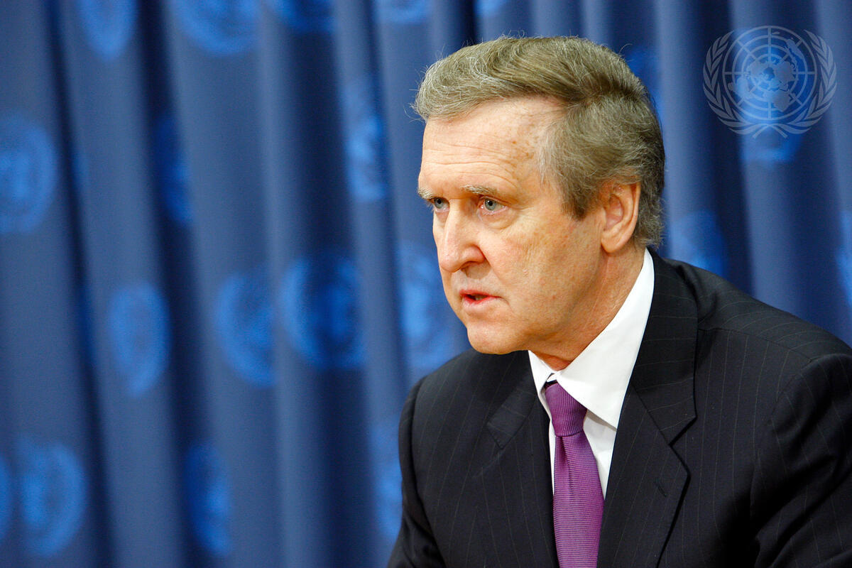 William Cohen, former Secretary of Defence of the United States of America, and co-chair of a Task Force on Genocide, addresses a press conference on the occasion of the 60th Anniversary of the United Nations Convention on the Prevention and Punishment of the Crime of Genocide.
