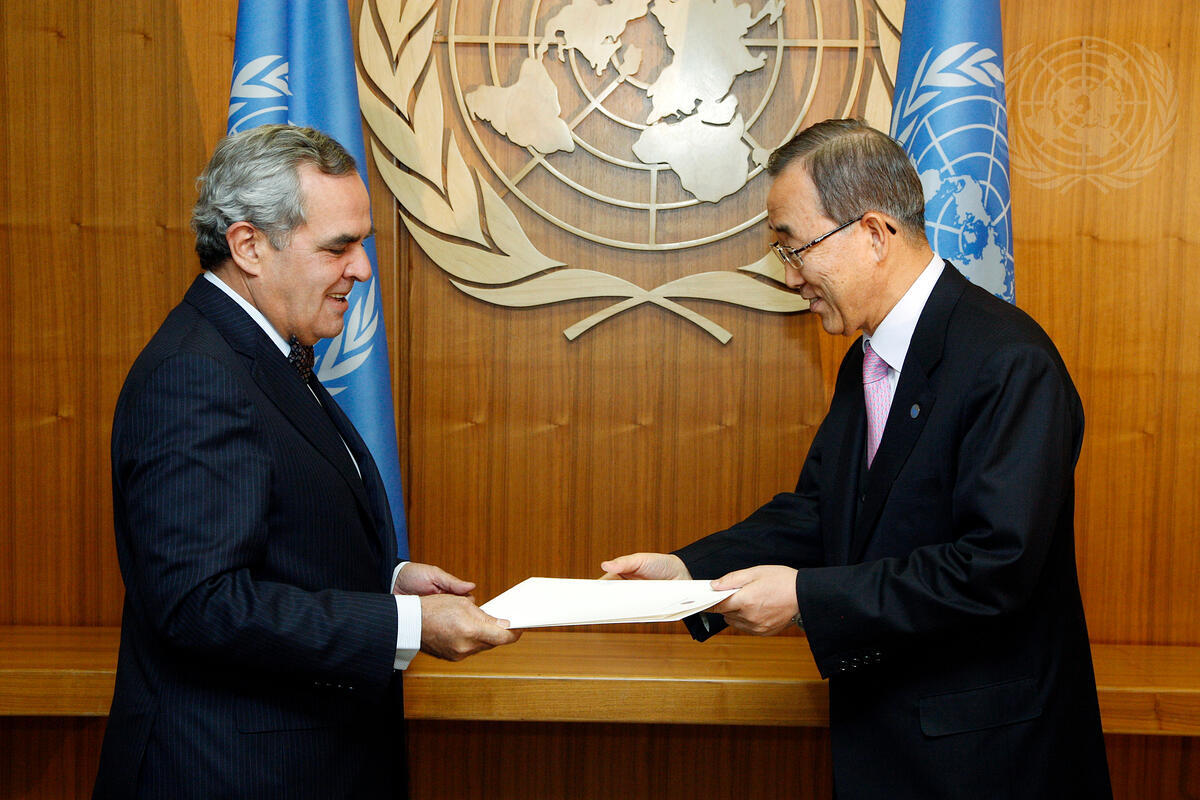 Secretary-General Ban Ki-moon (right) receives the credentials of José Filipe Mendes Moraes Cabral, new Permanent Representative of Portugal to the United Nations.