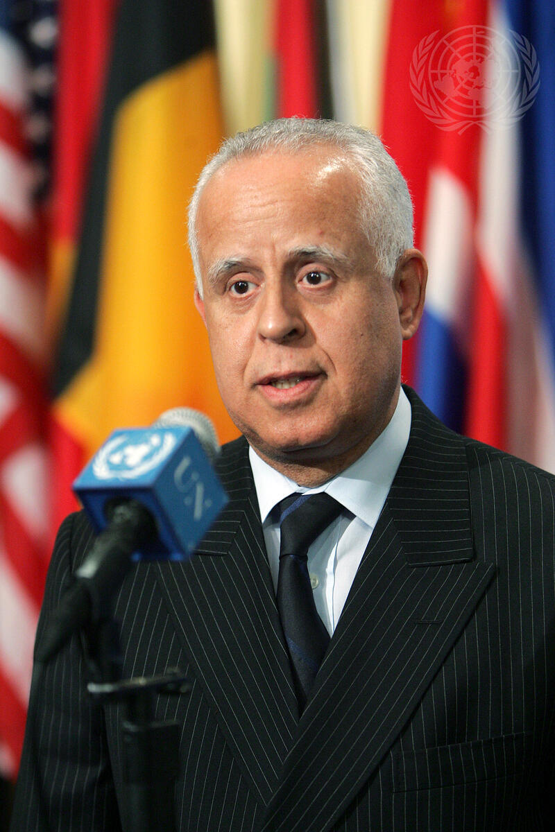 Mohammed Loulichki, Permanent Representative of Morocco to the United Nations, briefs the media outside of the Security Council Chamber.