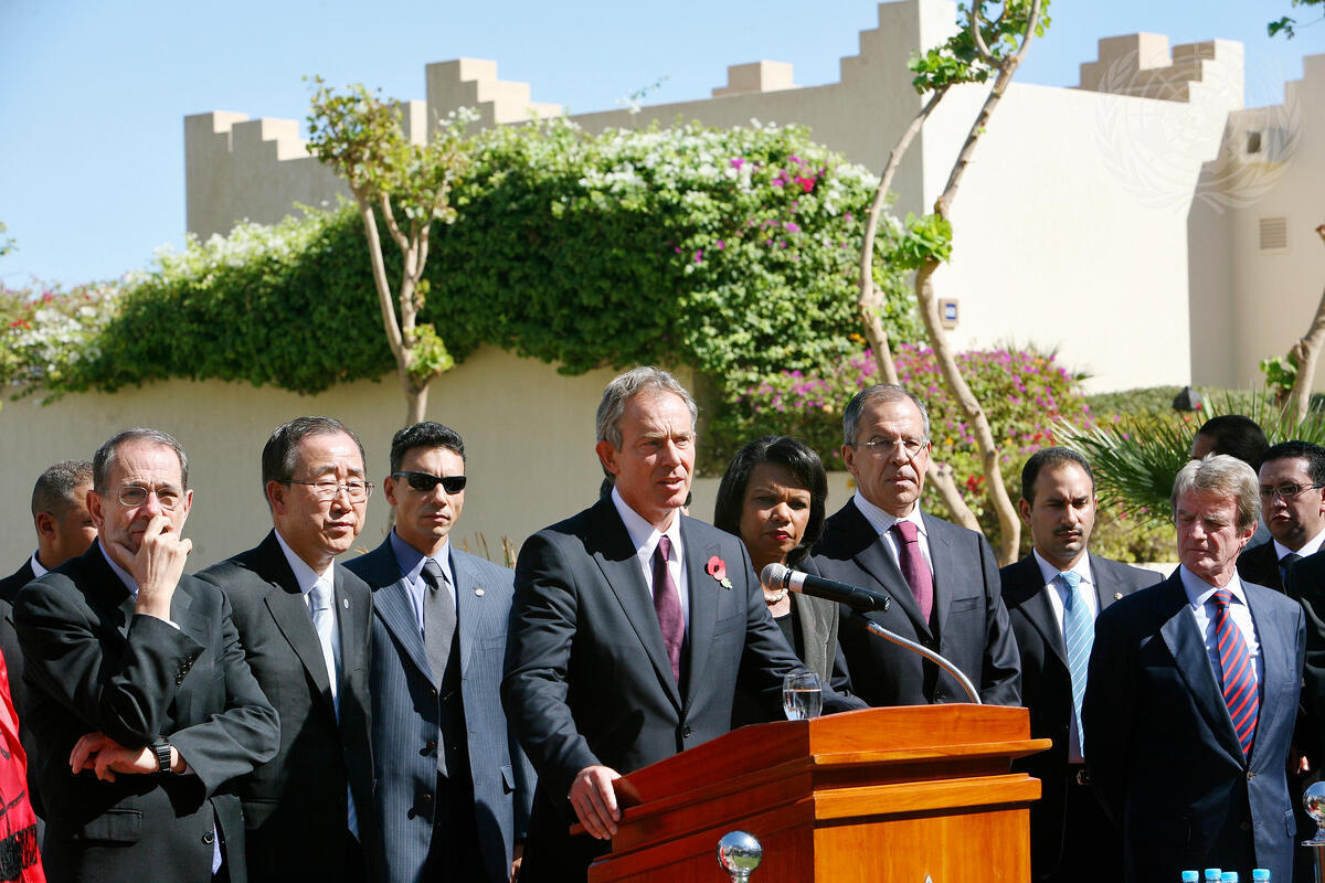 Tony Blair, Representative of the Middle East Quartet (European Union, Russian Federation, United Nations and United States), addresses a joint press conference following a meeting of the Quartet. Also participating in the press conference (from left to right): Javier Solana, High Representative for the Common Foreign and Security Policy of the European Union; United Nations Secretary-General Ban Ki-moon; Condoleezza Rice, United States Secretary of State; Sergey Viktorovich Lavrov, Minister for Foreign Affairs of the Russian Federation; and Bernard Kouchner, Minister for Foreign Affairs of France.