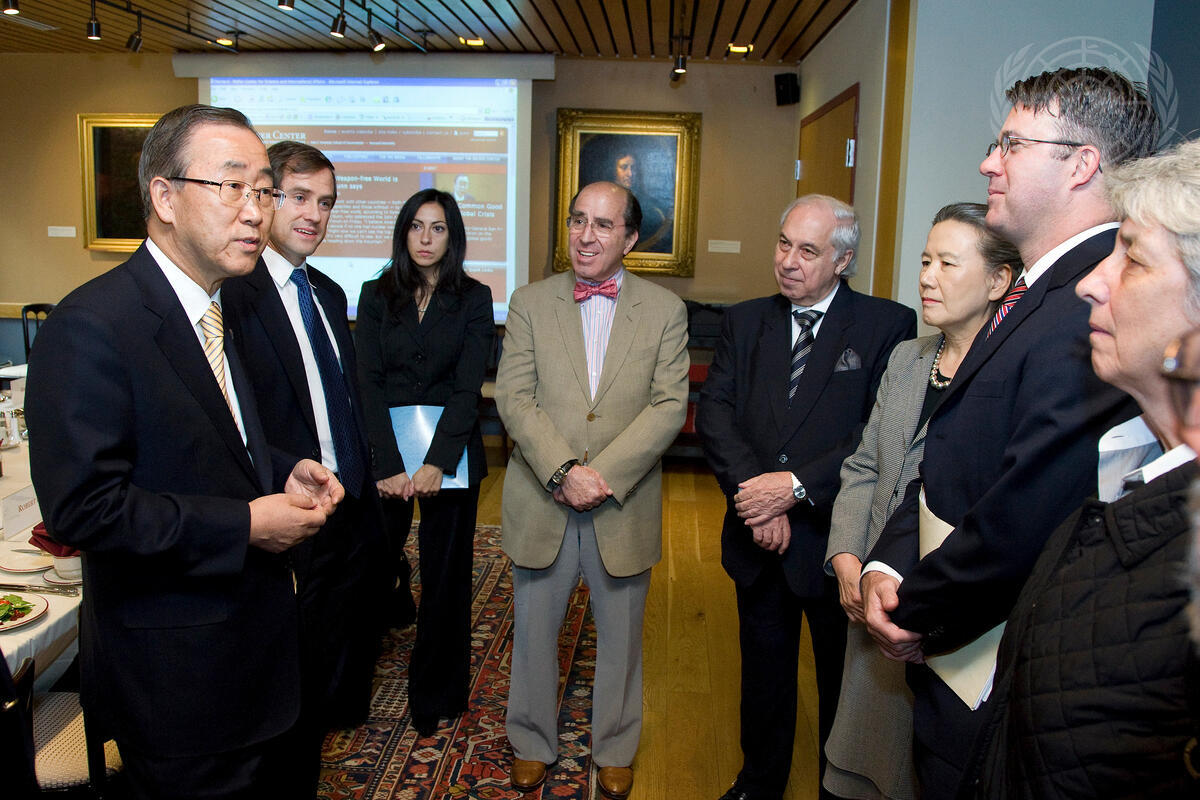 Secretary-General Ban Ki-moon (left), joined by his wife, Yoo Soon-taek (third from right), speaks with the guests at a luncheon hosted by the John Fitzgerald Kennedy (JFK) School of Government at Harvard University.