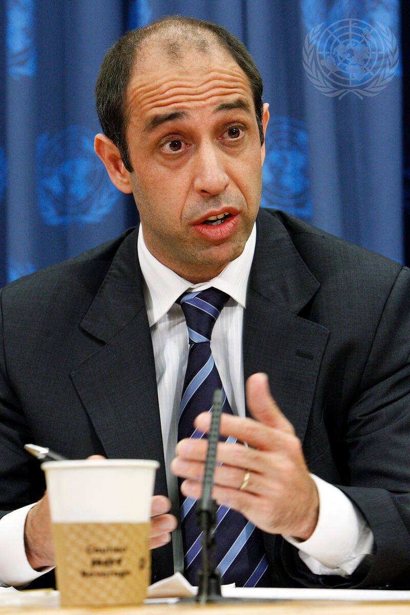 Tomás Ojea Quintana (left), Special Rapporteur on the situation of human rights in Myanmar, addresses a press conference, after presenting his report to the Third Committee (Social, Humanitarian and Cultural) of the General Assembly.