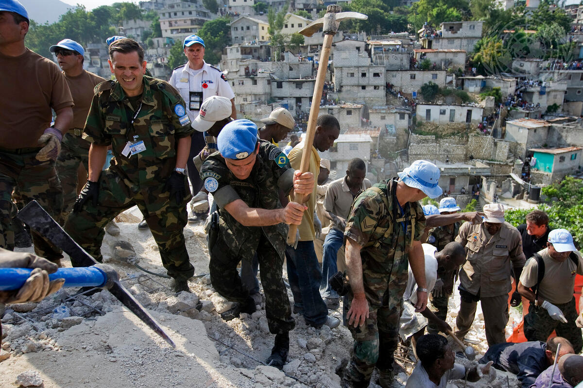 Carlos Alberto Dos Santos Cruz (centre), Force Commander of the United Nations Stabilization Mission in Haiti (MINUSTAH) and other military personnel of the United Nations peacekeeping mission, lead a rescue operation of the student survivors of the collapsed three-storey La Promesse College in a suburban shantytown, killing several people and injuring many more.