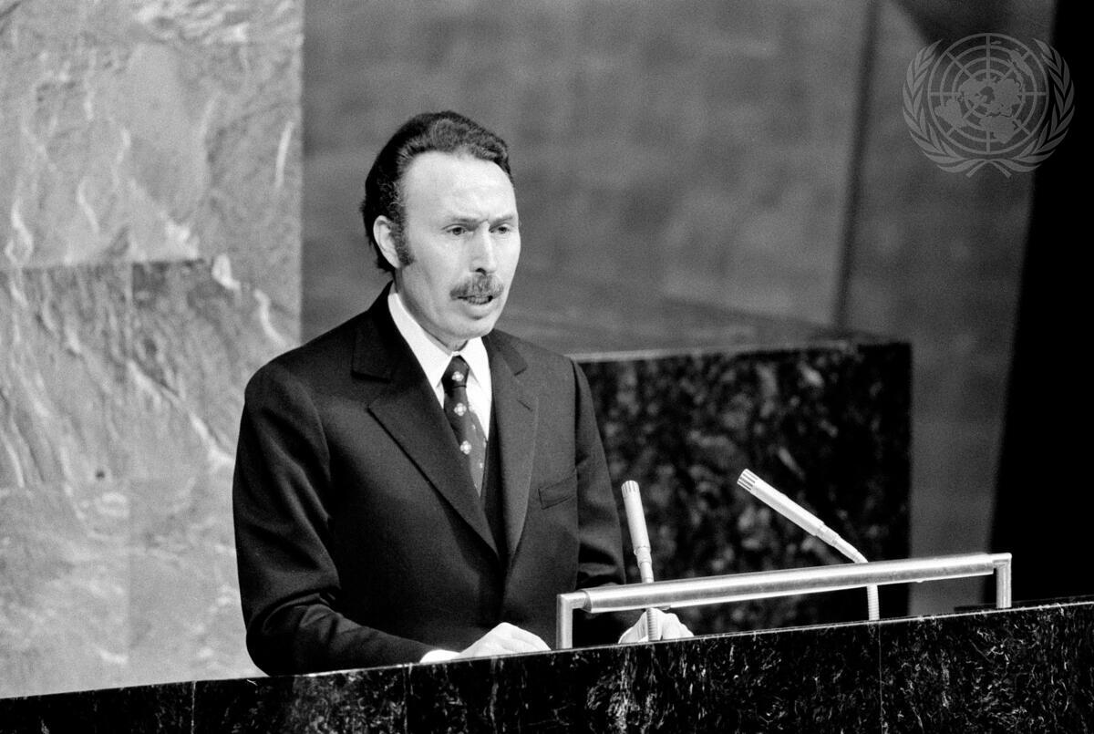 Houari Boumediene, President of the Revolutionary Council and of the Council of Ministers of Algeria, who had initiated the calling of the session, is seen addressing the Assembly.