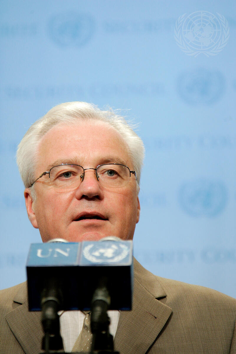 Vitaly I. Churkin, Permanent Representative of the Russian Federation to the United Nations, speaks to the media following a Security Council meeting on the latest developments in Georgia.