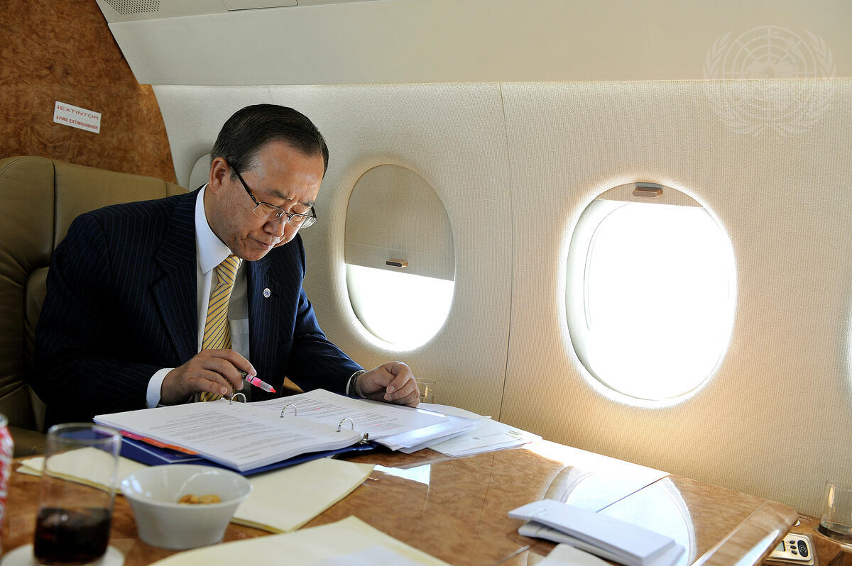 Secretary-General Ban Ki-moon works aboard the aircraft en route to Spain.