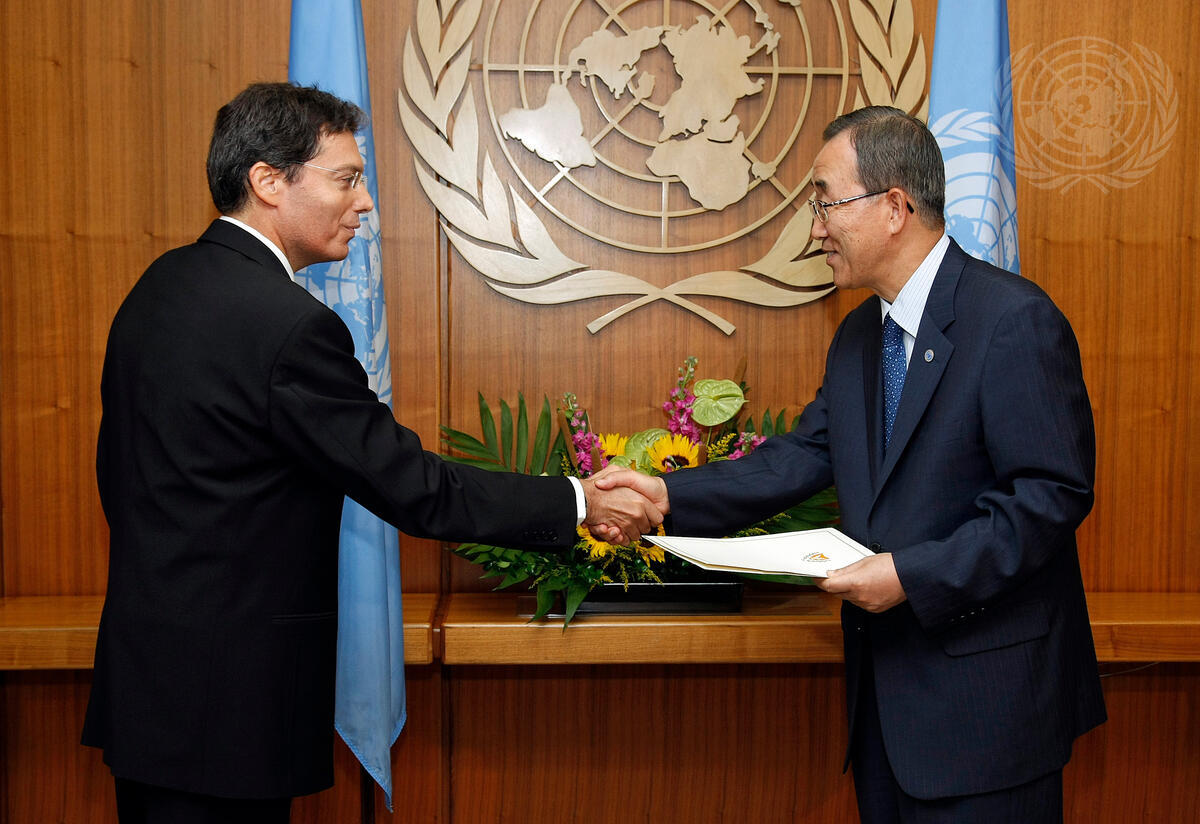 Secretary-General Ban Ki-moon (right) receives the credentials of Minas Hadjimichael, new Permanent Representative of Cyprus to the United Nations.