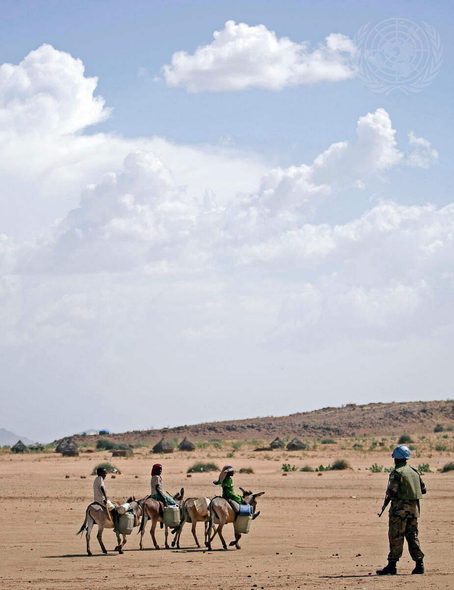 A patrolling member of the Rwandan battalion of the African Union-United Nations Hybrid Operation in Darfur (UNAMID) encounters children on donkeyback fetching water.