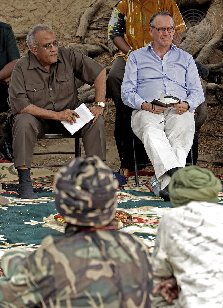 Salim Ahmed Salim (left), African Union (A.U.) Special Envoy for Darfur and Jan Eliasson (right), United Nations Special Envoy for Darfur, listen to deliberations during a meeting with the leadership of the Justice and Equality Movement in Darfur, Sudan.