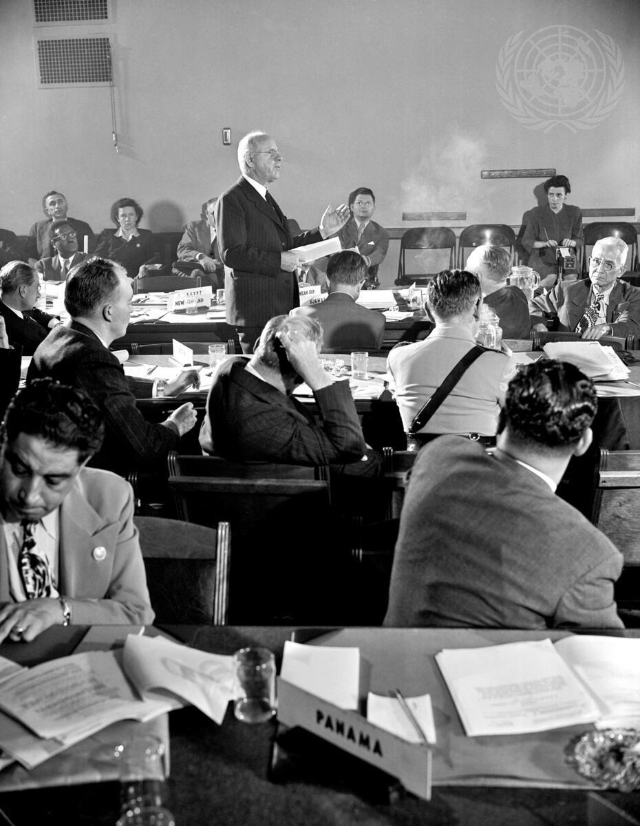 Peter Fraser, Chairman of the delegation from New Zealand, addresses the meeting of Commission I, Committee 2, held on 15 June 1945.