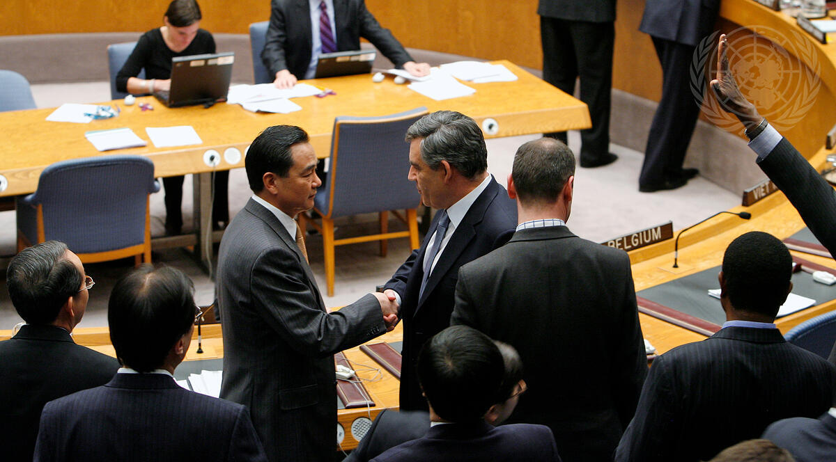 Wang Yi (third from left), Vice Minister for Foreign Affairs of the People's Republic of China (third from left), shakes hands with Gordon Brown, Prime Minister of the United Kingdom of Great Britain and Northern Ireland, prior to the Security Council high-level debate on peace and security in Africa.