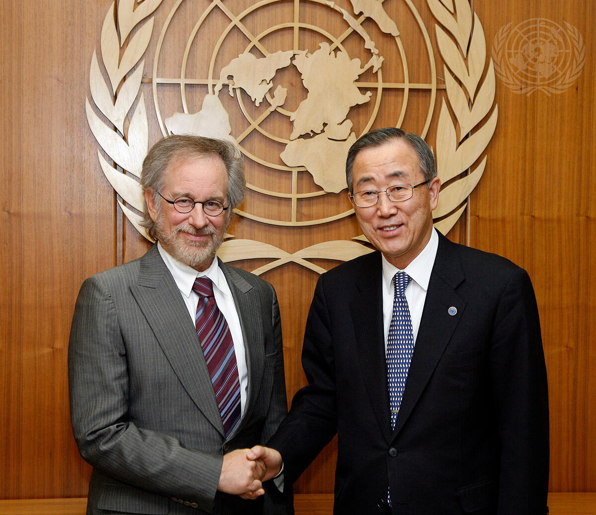 Secretary-General Ban Ki-moon (right) meets with Steven Spielberg, United States (US) academy award winning film director, producer, and screenwriter.