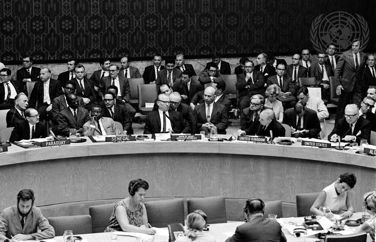 Miguel Solano Lopez (left) of Paraguay, addressing the Council. At the table with him are (l. to r.): Ibrahima Boye (Senegal), Yakov Malik (Soviet Union), Lord Caradon (United Kingdom) and George Ball (United States).