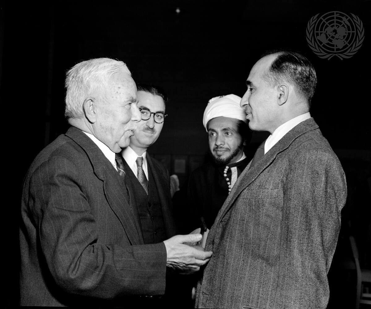 Delegates from Middle-Eastern countries, from left to right: H.E. Faris El-Khoury Bey, Permanent Representative of Syria; Dr. Mohamed Fadhil Al-Jamali, Chairman of the Iraqi Delegation; H.E. Sayed Kasan Ibrahim Yemenite Minister of State; and Ambassador Mahmoud Fawzi Bey, Permanent Representative to the United Nations.