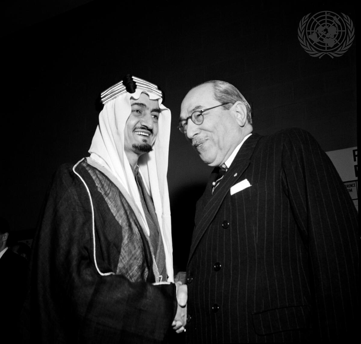 Prince Faisal al-Saud, of Saudi Arabia, congratulates Dr. Jose Arce of Argentina, upon his election as President of the 2nd Special Session of the United Nations General Assembly.