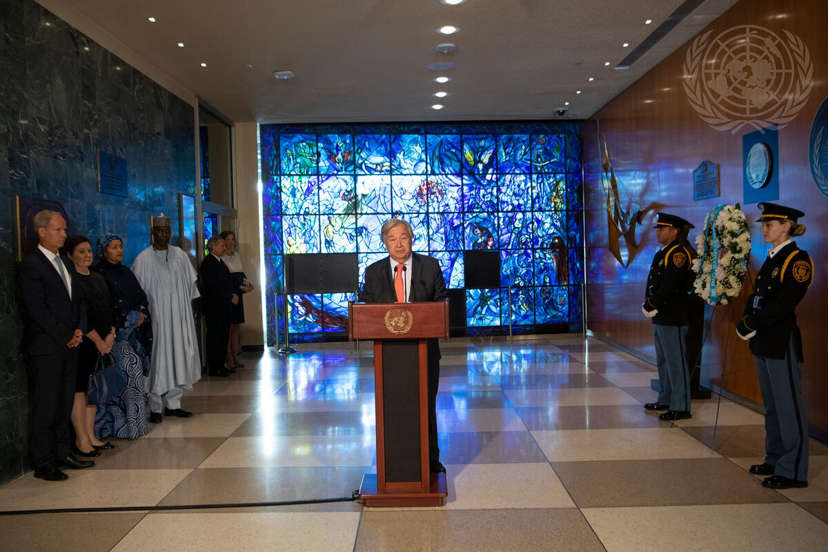 "Secretary-General António Guterres (at podium) addresses the wreath-laying ceremony to commemorate the 58th anniversary of the death of former Secretary-General Dag Hammarskjöld.