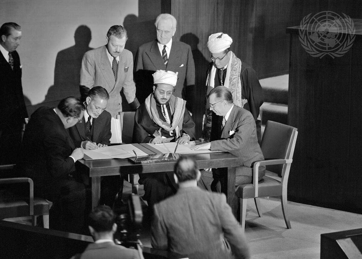 Seated at the table in Mr. Lie's office are, from left: Trygve Lie, United Nations Secretary-General; Sir Mohammad Zafarullah Khan of Pakistan; Prince Seif el Islam Abdullah of Yemen, and Dr. Ivan Kerno, Assistant Secretary-General of United Nations Legal Department. Standing from left: Dr. Hanna Saba, Director of Treaties Division UN Legal Department; Dr. Oswaldo Aranha, Brazil, president of General Assembly and Dr. Hassan Baghdadi, Yemen, Advisor.