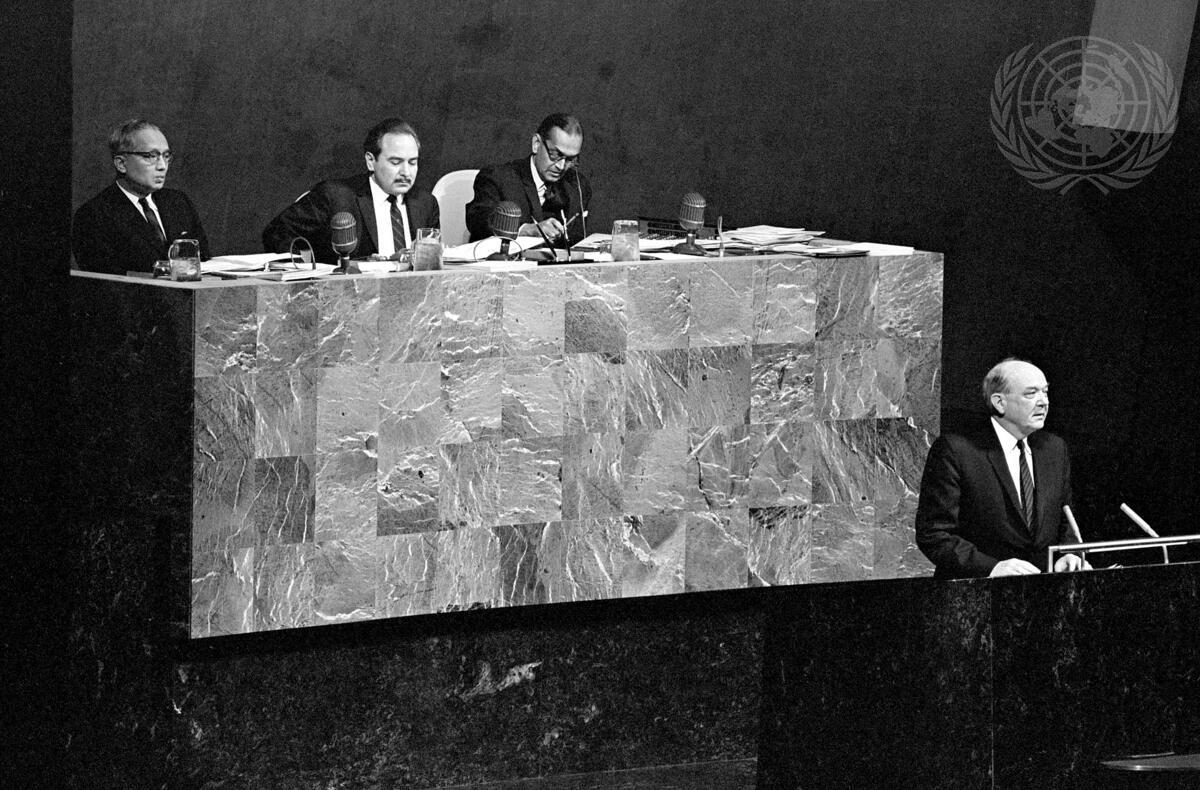 Dean Rusk (at speaker's rostrum), Secretary of State of the United States, addressing the Assembly. At the presidential rostrum, from left: Secretary-General U Thant; Emilio Arenales (Guatemala), Assembly President; and C. V. Narasimhan, Under-Secretary-General for General Assembly Affairs and Chef de Cabinet.