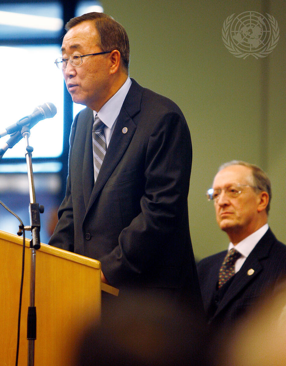 Secretary-General Ban Ki-moon holds a town hall meeting with the staff of United Nations Office at Vienna (UNOV), as Antonio Maria Costa, Executive Director of the United Nations Office on Drugs and Crime, listens.
