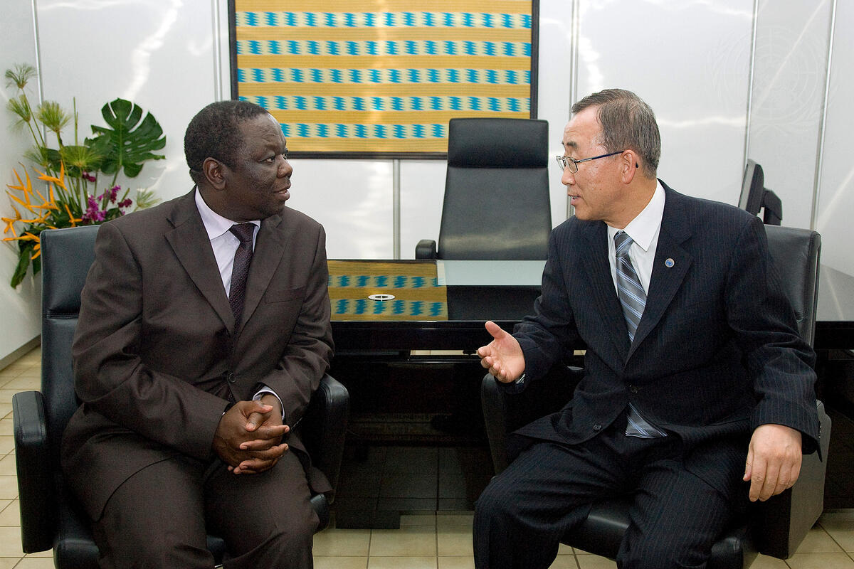 Secretary-General Ban Ki-moon (right) holds a bilateral meeting with Morgan Tsvangirai, Leader of the Movement for Democratic Change (MDC) of Zimbabwe.