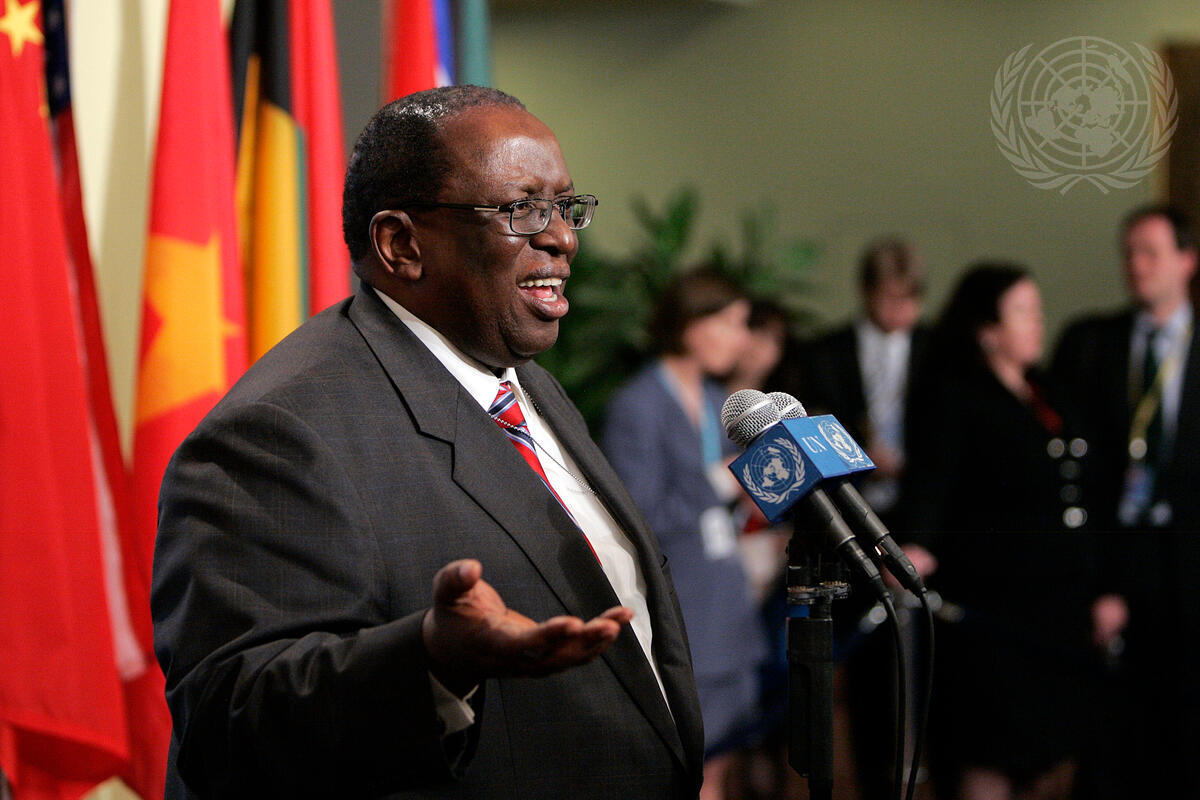 Dumisani S. Kumalo, Permanent Representative of the Republic of South Africa to the United Nations, and President of the Security Council for April, briefs journalists following a Council meeting on the situation in Somalia, and the current political crisis in Zimbabwe.