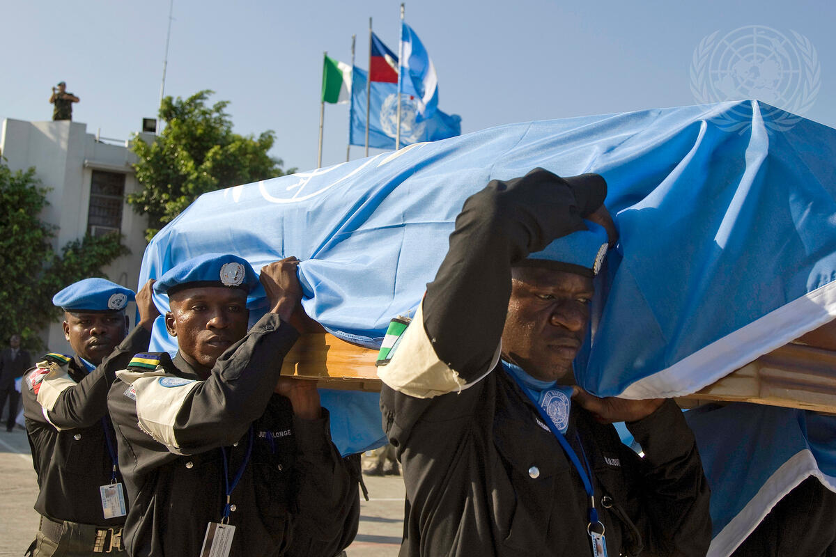 Members of the Nigerian Police Unit of the United Nations Stabilization Mission in Haiti (MINUSTAH) carry a coffin of their colleague Corporal Aminu Nagya, killed during the 12 April 2008 food crisis.