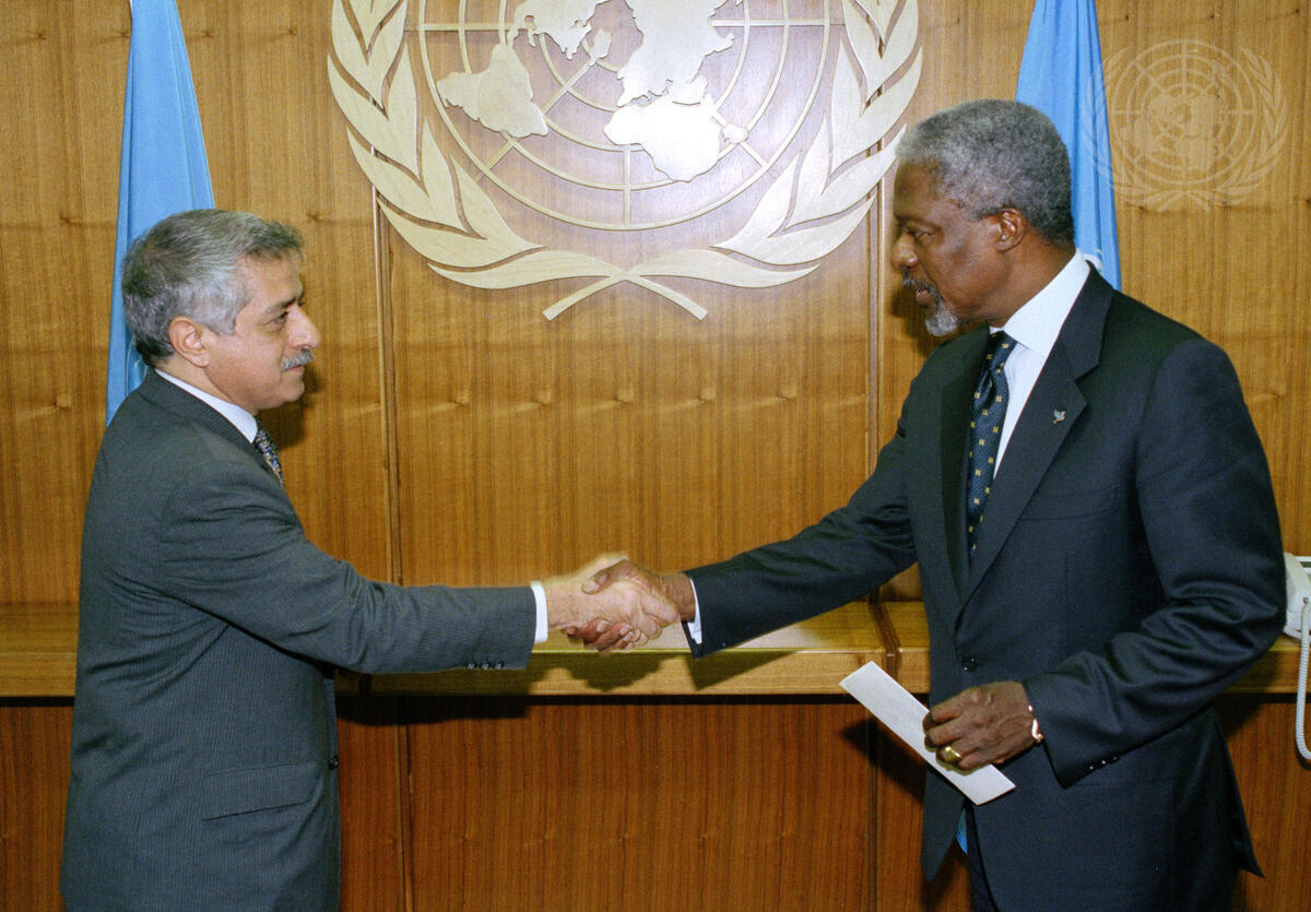 Alfonso Valvieso, the new Permanent Representative of Colombia to the United Nations, presents his credentials to Secretary-General Kofi Annan (right).