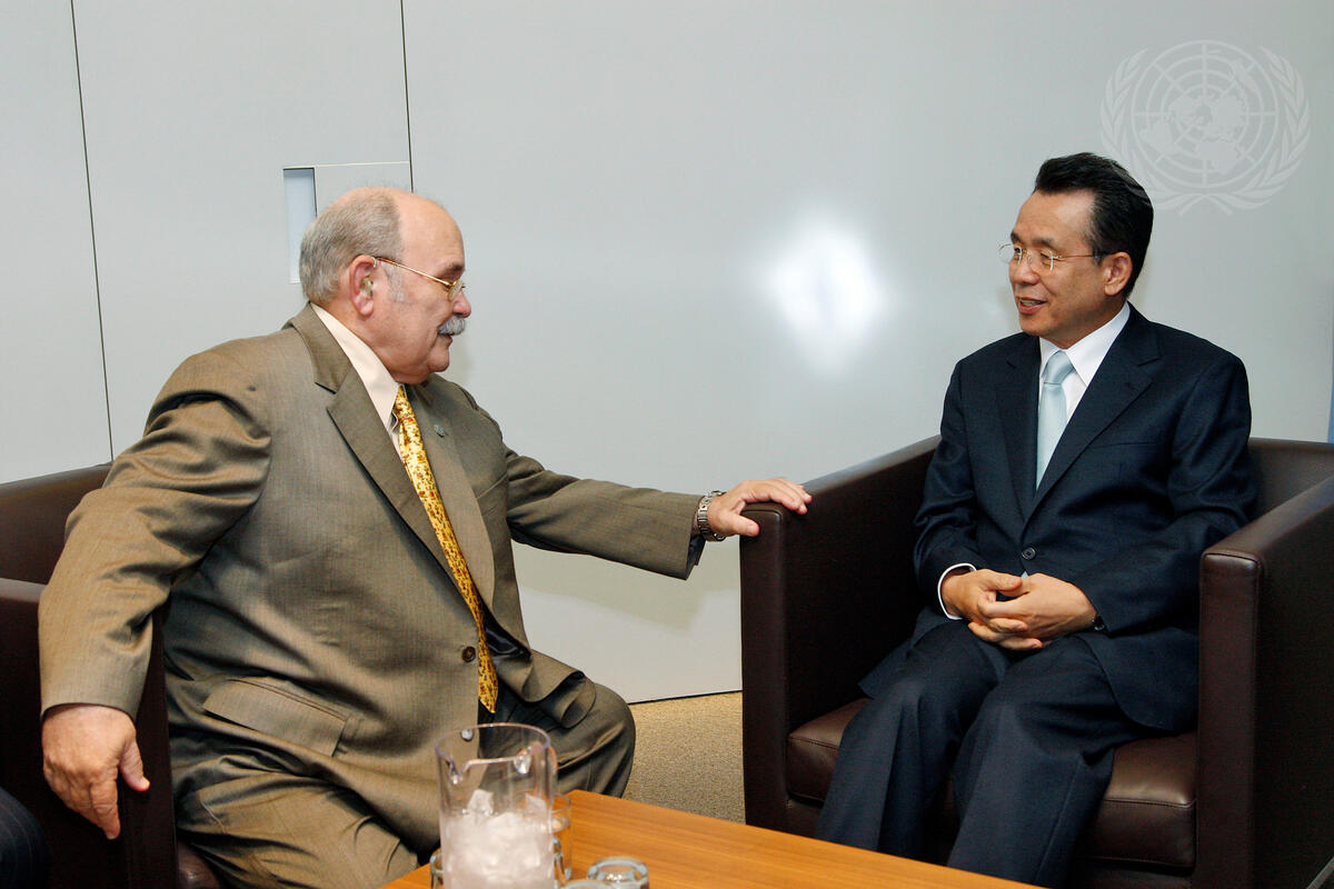 Miguel d'Escoto Brockmann (left), President of the sixty-third session of the General Assembly, holds talks with Han Seung-soo, Prime Minister of the Republic of Korea.