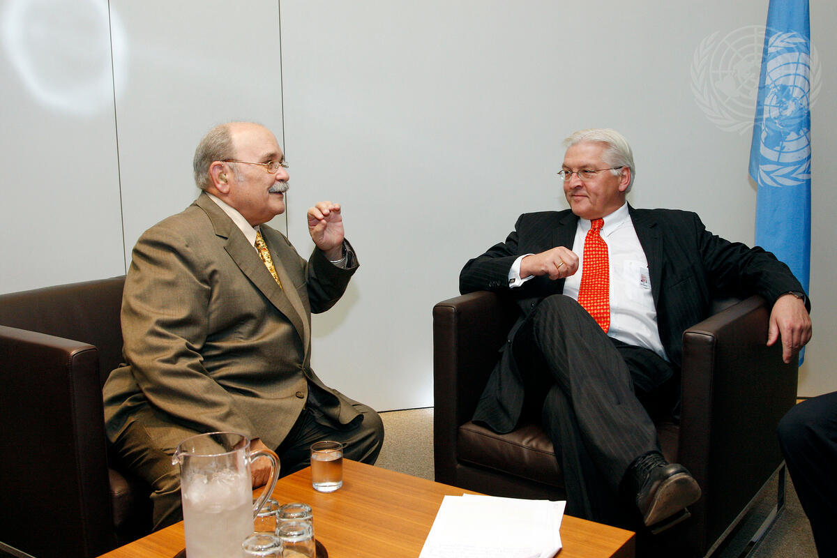 Miguel d'Escoto Brockmann (left), President of the sixty-third session of the General Assembly, holds talks with Frank-Walter Steinmeier, Minister for Foreign Affairs of Germany.