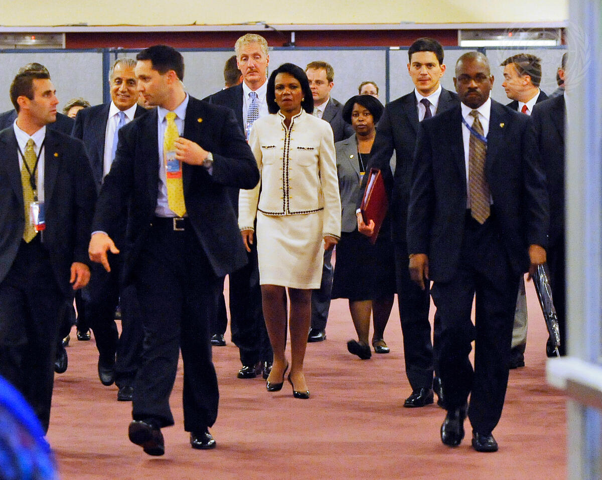 Condoleezza Rice (sixth from left), United States Secretary of State, and David Miliband (third from right), Secretary of State for Foreign and Commonwealth Affairs of the United Kingdom of Great Britain and Northern Ireland, en route to a ministerial meeting.