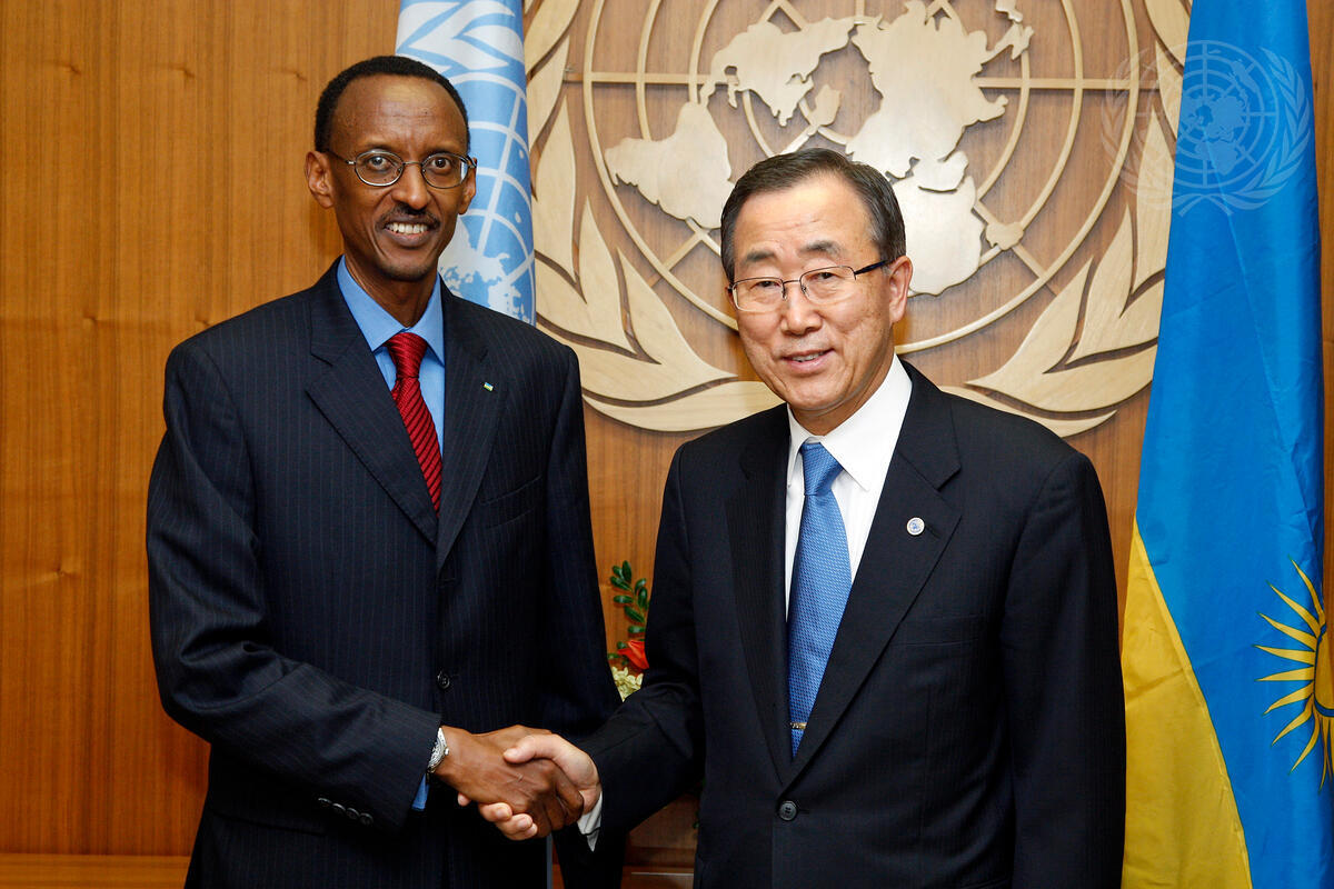 Secretary-General Ban Ki-moon (right) meets with Paul Kagame, President of the Republic of Rwanda.