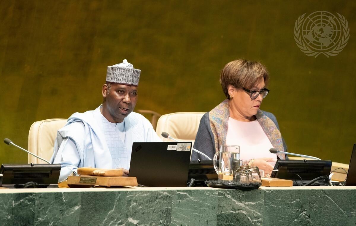 Tijjani Muhammad-Bande, President of the seventy-fourth session of the General Assembly, opens the first plenary meeting of the seventy-fourth session of the General Assembly. At right is Ruth de Miranda, Director of the General Assembly and Economic and Social Council (ECOSOC) Affairs Division of the Department of General Assembly and Conference Management (DGACM).