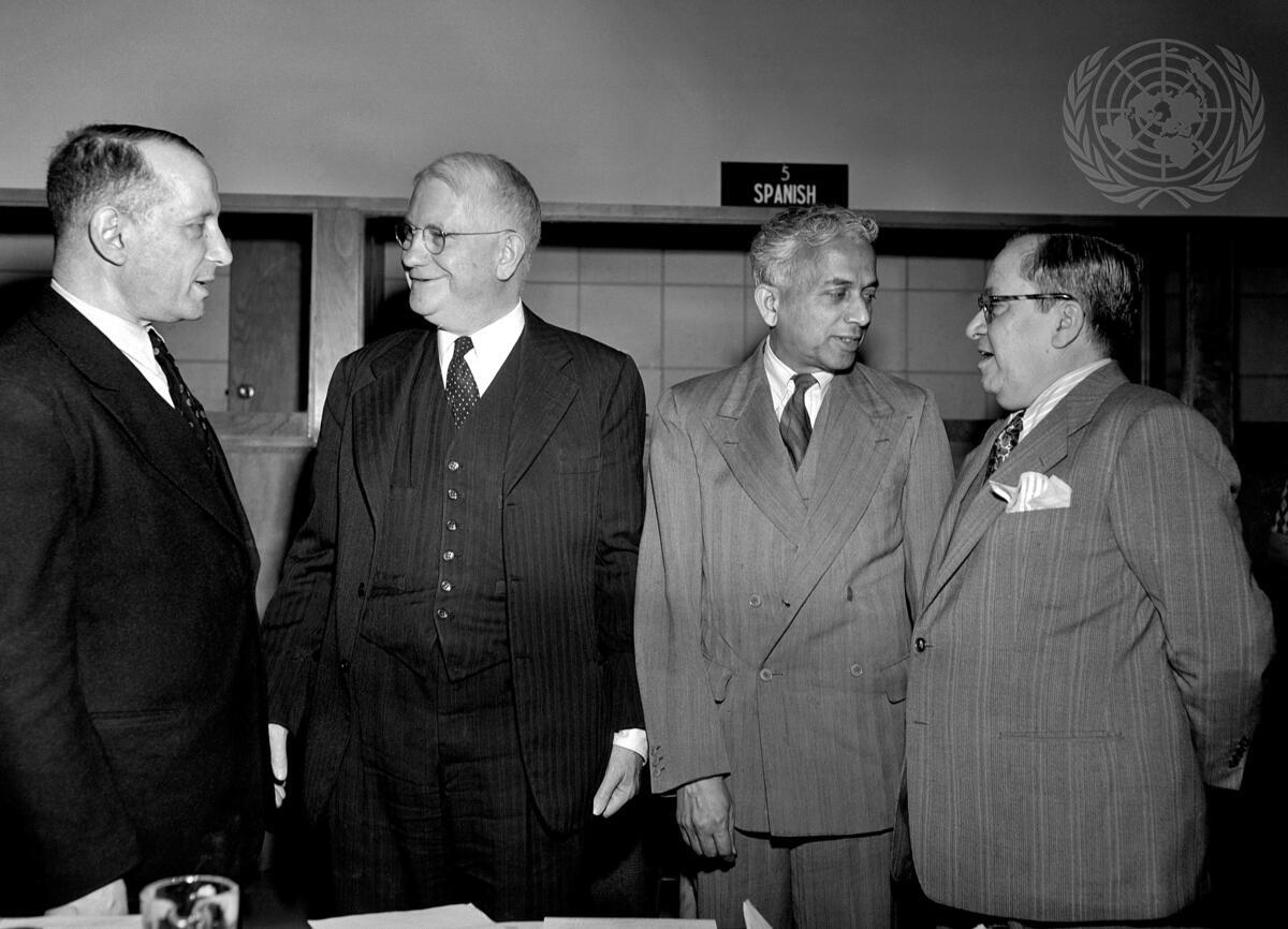 Charged with the fundamental job of developing and codifying international law which is to govern the conduct of nations, the International Law Commission of the United Nations is now holding its first session at Lake Success, N.Y. Members of the Commission shown here at U.N. Headquarters are: Left to right; Dr. Vladimir Koretsky, of the USSR; Chairman Judge Manley Hudson of the United States, Sir Benegal Rau, of India; and Dr. A. Amado of Brazil.