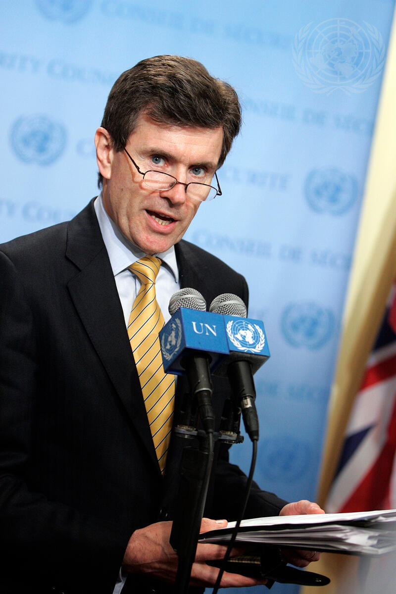 John Sawers, Permanent Representative of the United Kingdom of Great Britain and Northern Ireland, and President of the Security Council for May, briefs correspondents following a meeting on the situation in Lebanon, and relief efforts in Myanmar.