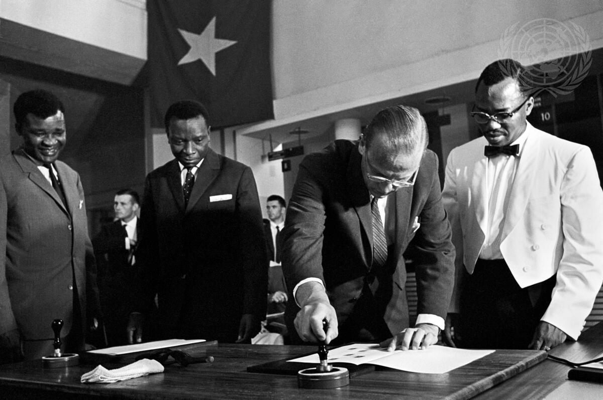 Dr. Sture Linner (2nd from right), Officer-in-Charge of United Nations Operations in the Congo, making cancellations of First Day issues of the “Dag Hammarskjöld memorial stamp” at a ceremony held here earlier today to mark issuance of the stamp by the Congo (Leopoldville). Among those looking on are Prime Minister Cyrille Adoula (2nd from left) and Mr. Ferdinand Mungamba (r.), Minister of Post and Telecommunications of the Congo, who devised the theme of the stamp as a symbol of the late Secretary-General's concern for the Congo.