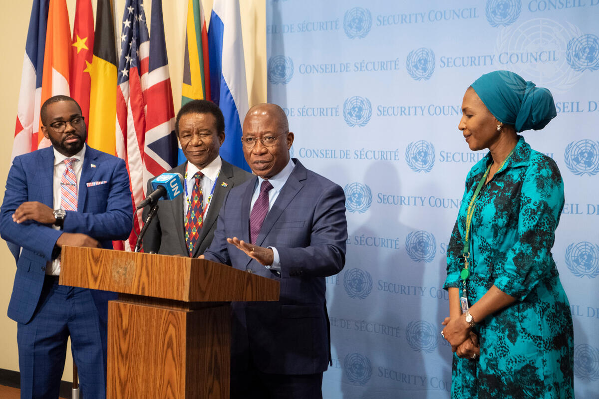 Behind him at second from left is Jerry Matthews Matjila, Permanent Representative of the Republic of South Africa to the UN, and a representative from the Permanent Mission of Equatorial Guinea to the UN. At right is Fatima K. Mohammed, Permanent Observer of the African Union."