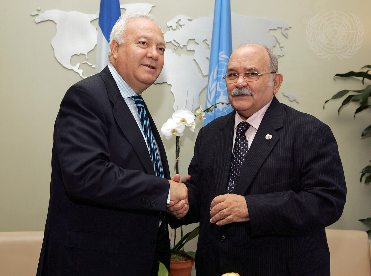 Miguel d'Escoto Brockmann (right), President of the sixty-third session of the General Assembly, meets with Miguel Ángel Moratinos, Minister for Foreign Affairs of Spain.